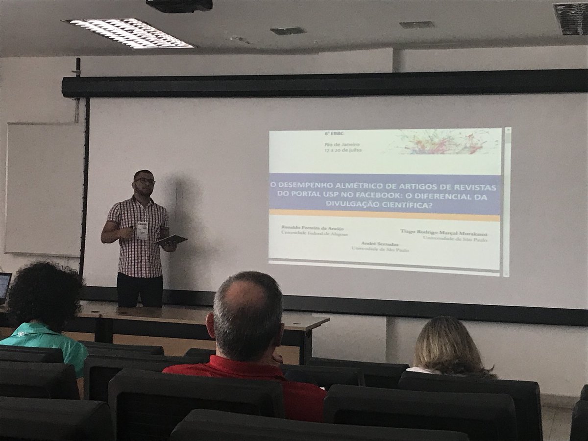 O primeiro trabalho "O desempenho Almétrico de artigos de revistas do portal USP no Facebook: o diferencial da divulgação científica?" com colaboração com Tiago Rodrigo Marçal Murakami (SiBi/USP) e André Serradas (SiBi/USP) analisa o desempenho dos artigos das revistas do Portal USP quando às métricas alternativas de atenção online e interações no Facebook e verifica se tal desempenho apresenta alguma relação com as ações de divulgação científica da instituição.