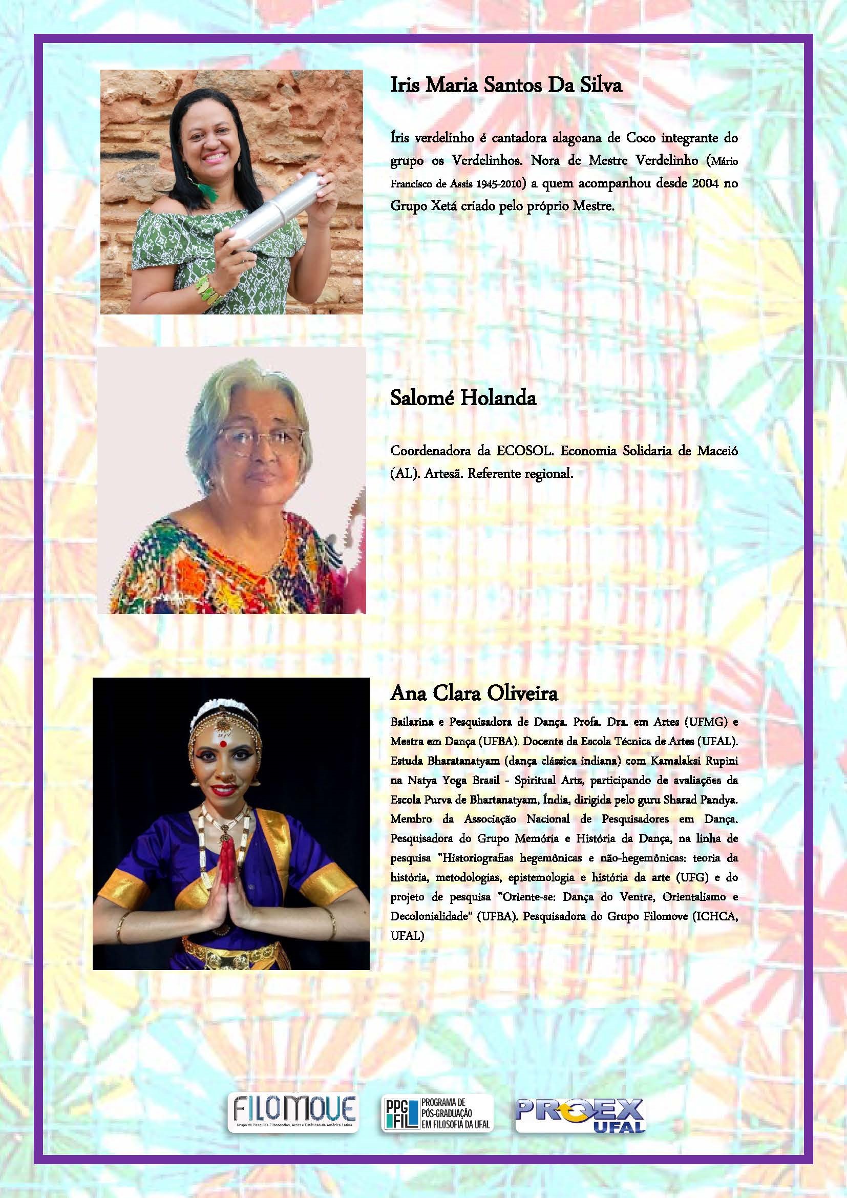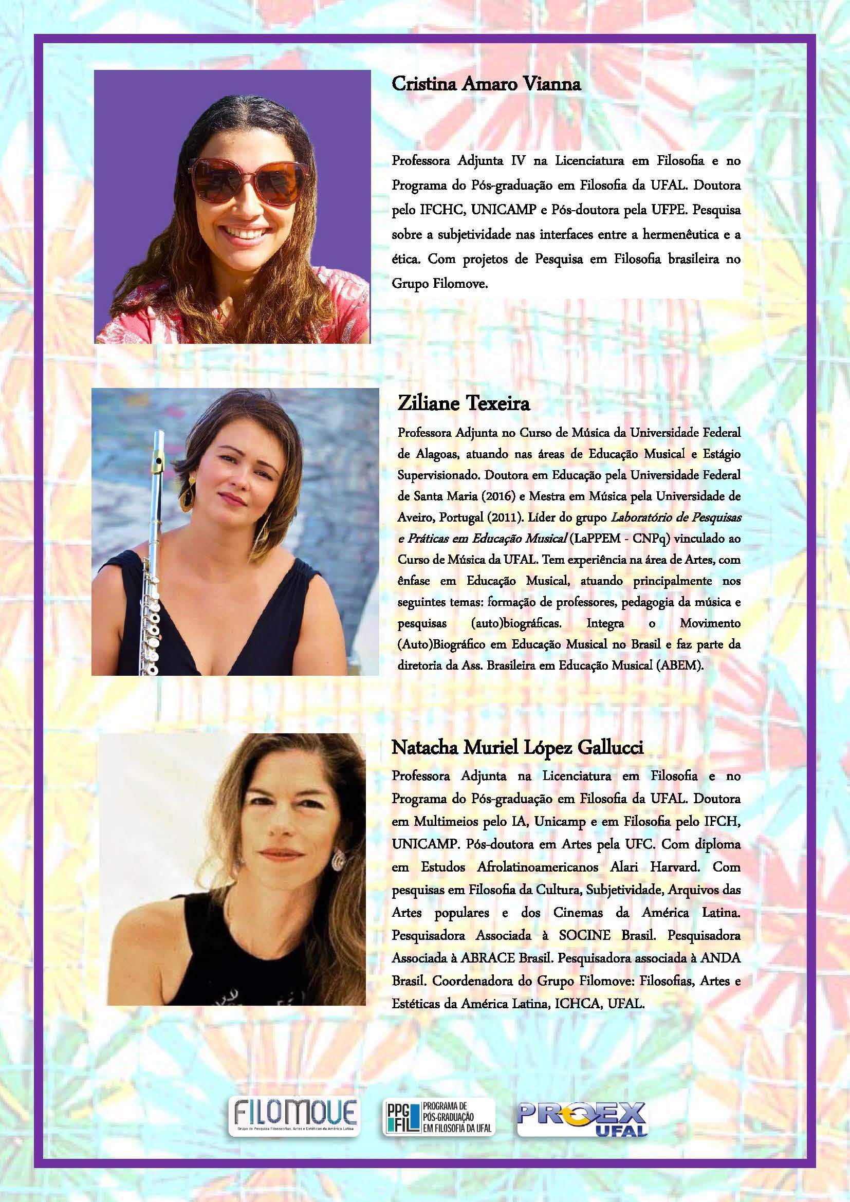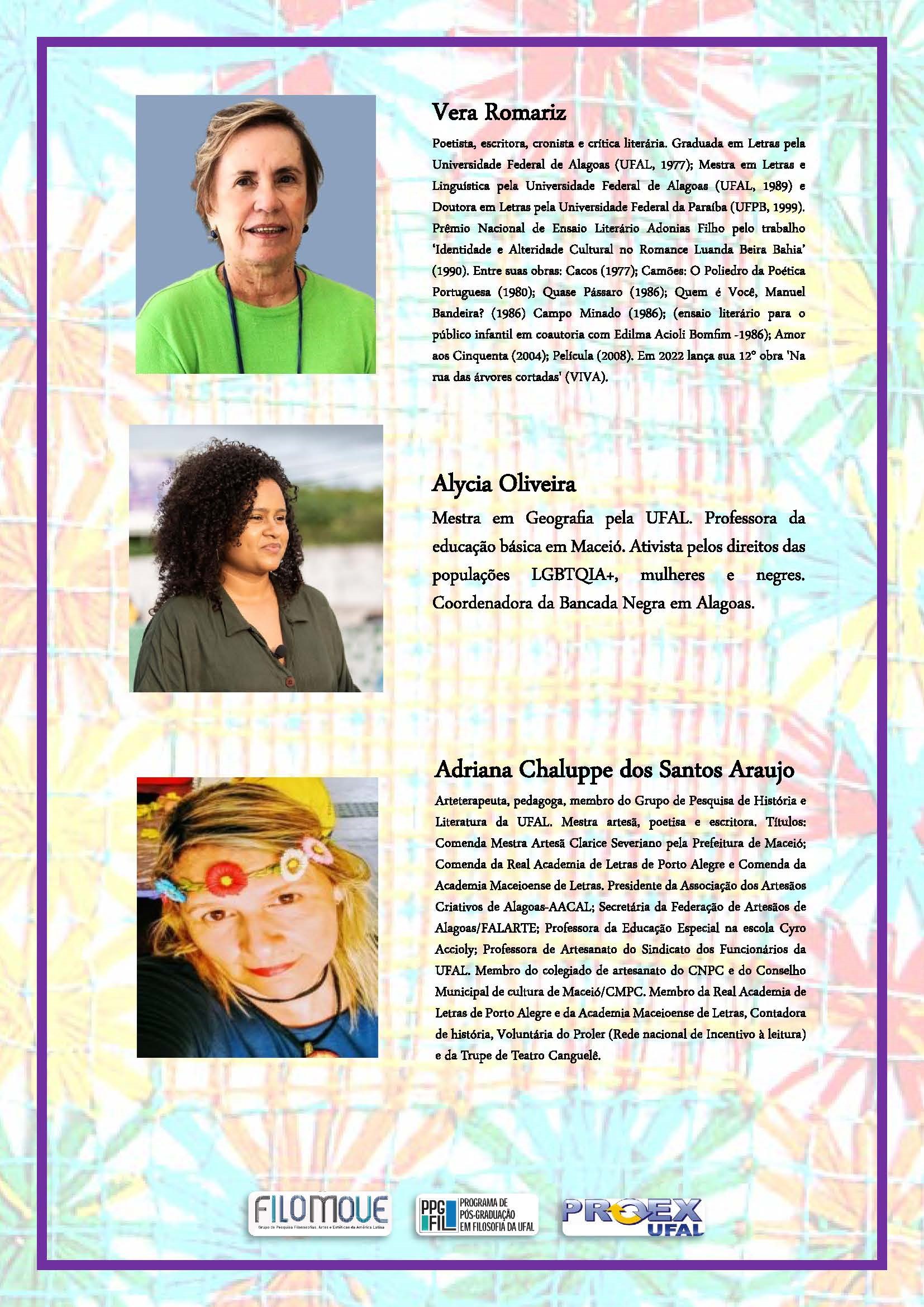 O objetivo é refletir sobre as subjetividades das mulheres na região sob diversas categorias: Economia Solidária, Política e Bancada Negra, Ensino das Artes, Corpos dissidentes, Mulheres na Filosofia, apresentando as estratégias e redes que fazem parte de AÇOES PROPOSITIVAS contemporâneas de referentes de Maceió (em ordem alfabética): Adriana Chaluppe dos Santos Araújo, Alycia Oliveira, Ana Clara Oliveira, Cristina Amaro Vianna, Iris Maria Santos Da Silva, Salomé Holanda, Vera Romariz e Ziliane Teixeira. Após das falas das convidadas o debate será coordenado pela Prof. Dra. Natacha Muriel López Gallucci.