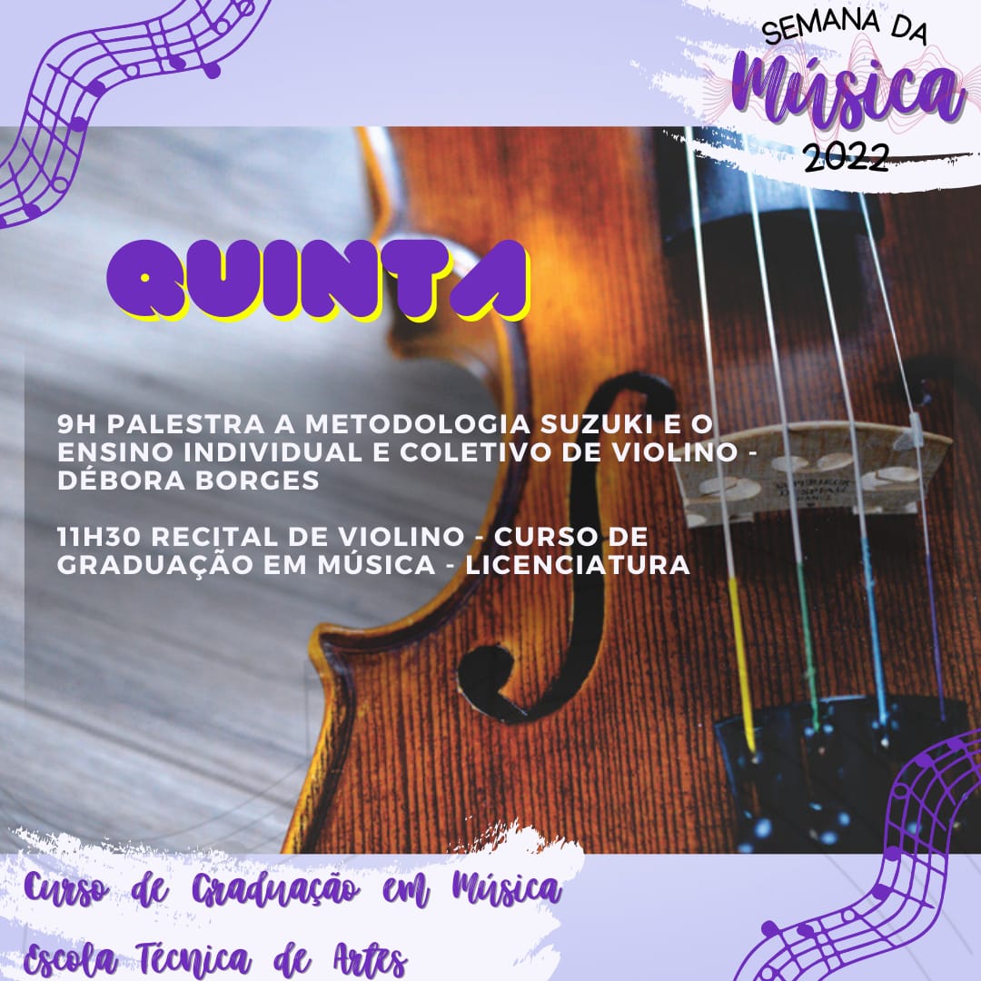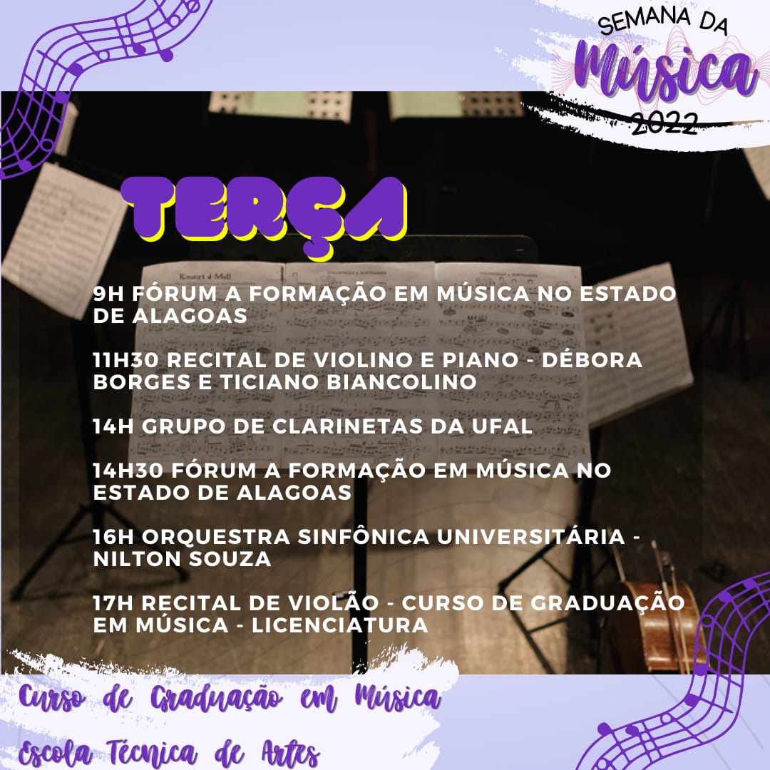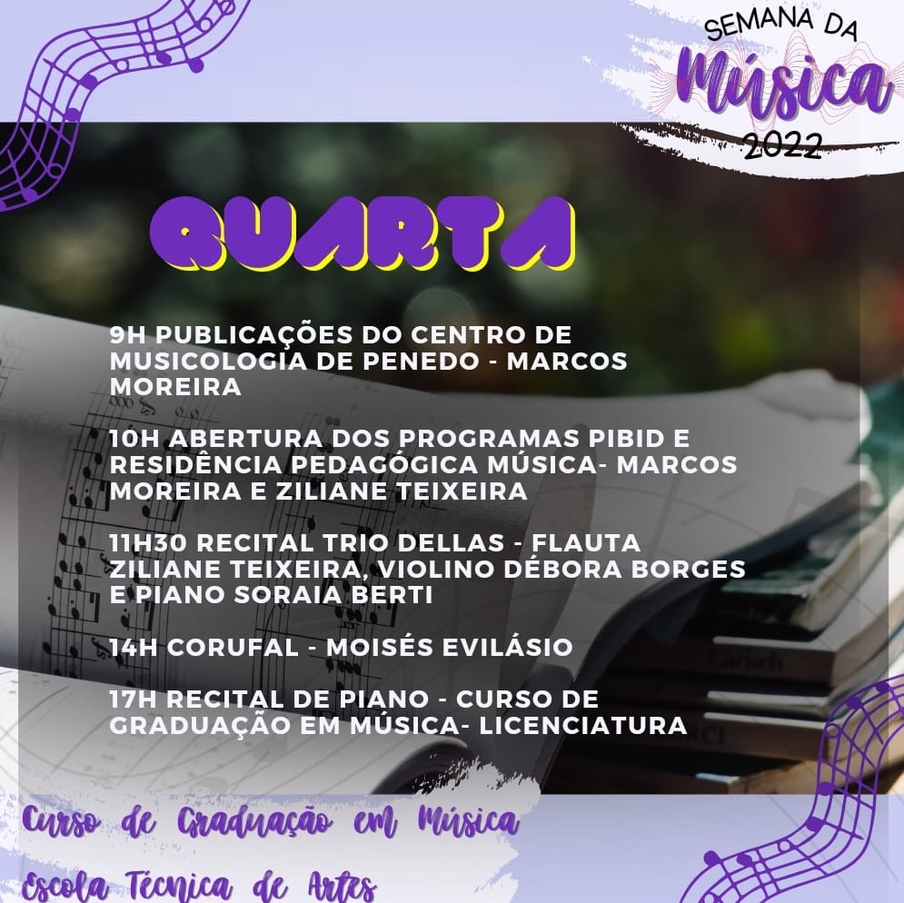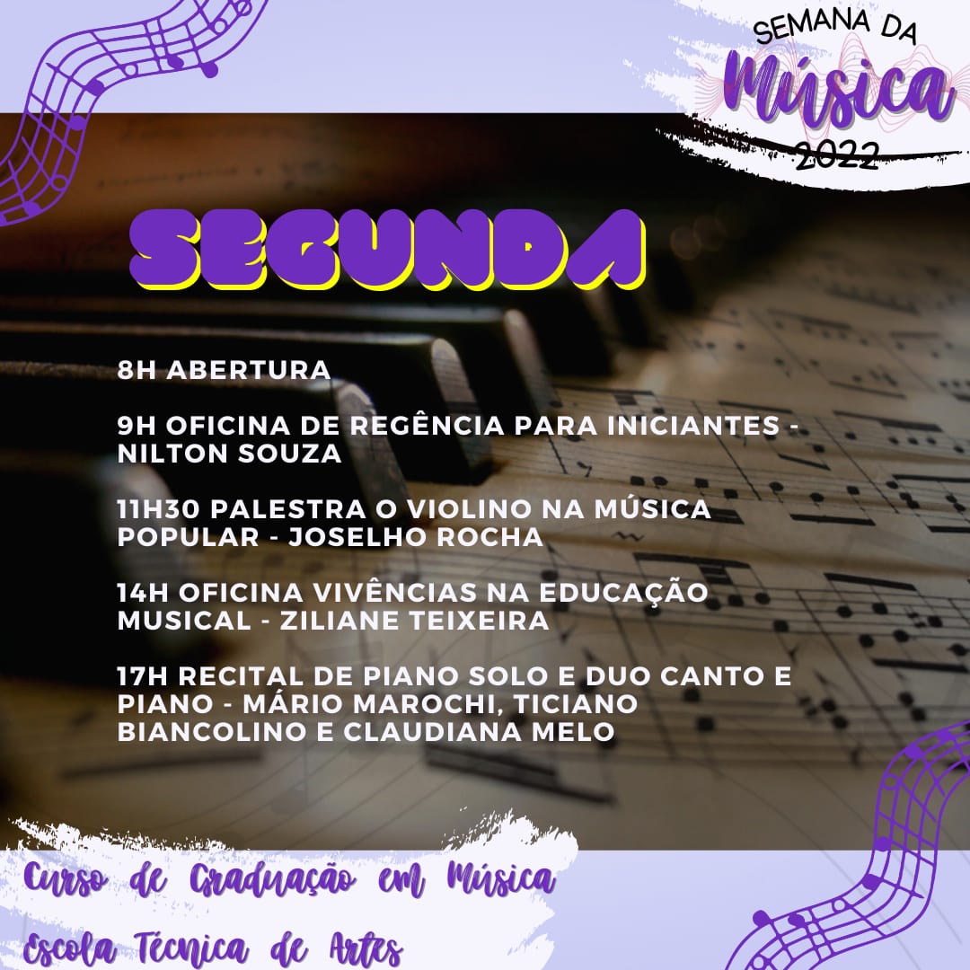 A partir da próxima segunda-feira, 21 de novembro, seguindo até a sexta (25), estudantes do Curso de Música Licenciatura e Escola Técnica, além de músicos, arte-educadores, pedagogos, e demais membros da comunidade poderão acompanhar e participar da edição deste ano da Semana da Música.
