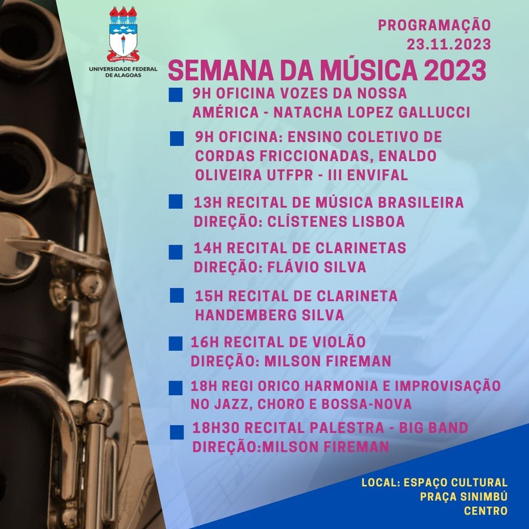 A partir do dia 21 de novembro, seguindo até a sexta (25), estudantes do Curso de Música Licenciatura e Escola Técnica, além de músicos, arte-educadores, pedagogos, e demais membros da comunidade poderão acompanhar e participar da edição deste ano da Semana da Música.