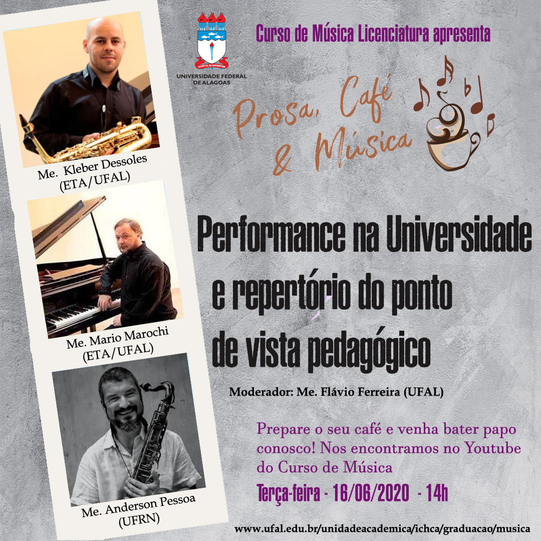 O próximo episódio da série “Prosa, Café & Música” acontecerá dia 16 de junho com o tema "Performance na universidade e repertório do ponto de vista pedagógico". Os convidados para este webinário são os professores Kleber Dessoles e Mario Marochi, da Escola Técnica de Artes da UFAL e o professor Anderson Pessoa da UFRN. O debate será moderado pelo professor Flávio Ferreira, coordenador do curso de Música da UFAL.