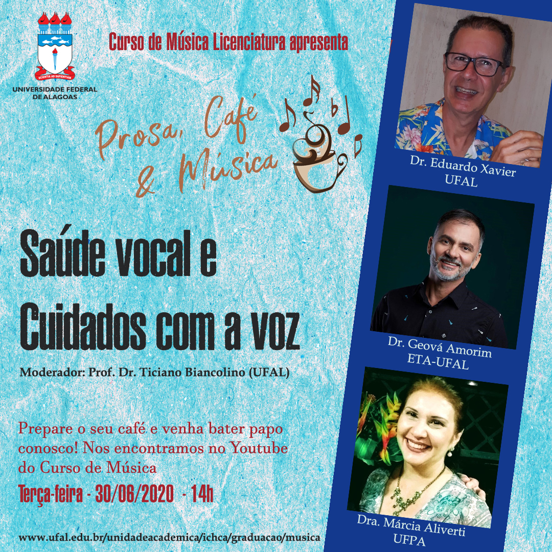 A série Prosa, Café & Música é uma ação do Curso de Música Licenciatura da UFAL que recebe convidadas/os às terças-feiras às 14h para discutirem temas de interesse de músicos, educadores musicais, estudantes de música e da comunidade em geral. Inscreva-se no canal no Youtube, ative as notificações e acesse nosso site para acompanhar nossas atividades.