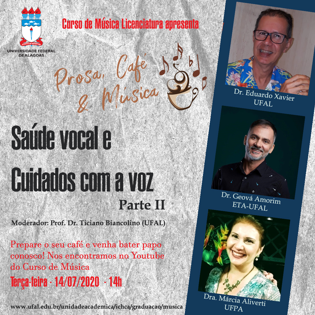 A série Prosa, Café & Música é uma ação do Curso de Música Licenciatura da UFAL que recebe convidadas/os às terças-feiras às 14h para discutirem temas de interesse de músicos, educadores musicais, estudantes de música e da comunidade em geral. Inscreva-se no canal no Youtube, ative as notificações e acesse nosso site para acompanhar nossas atividades.