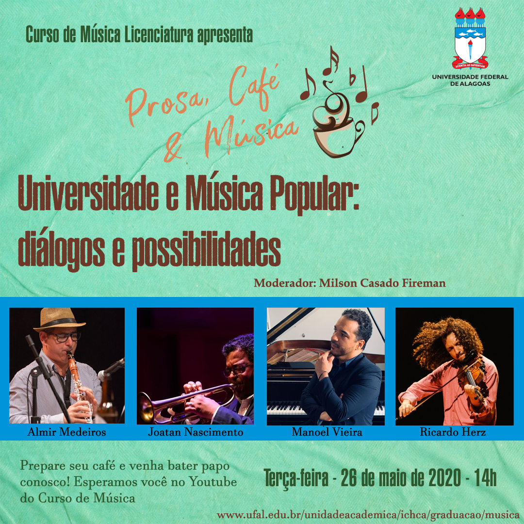 O próximo episódio da série “Prosa, Café & Música” acontecerá dia 26 de maio com o tema Universidade e Música Popular: diálogos e possibilidades. Os convidados para este webinário são os músicos Almir Medeiros, Joatan Nascimento, Manoel Vieira e Ricardo Herz. O debate será moderado pelo professor Milson Fireman.