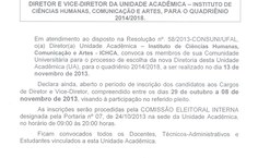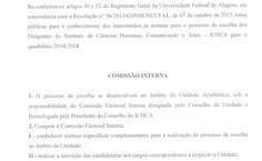 Atenção, professores do Instituto de Ciências Humanas Comunicação e Artes (ICHCA): os interessados em concorrer às vagas de diretor e vice-diretor do Instituto têm até amanhã (08) para inscrever as chapas que disputarão a eleição. Abaixo, constam nos documentos as instruções necessárias para realização da inscrição.