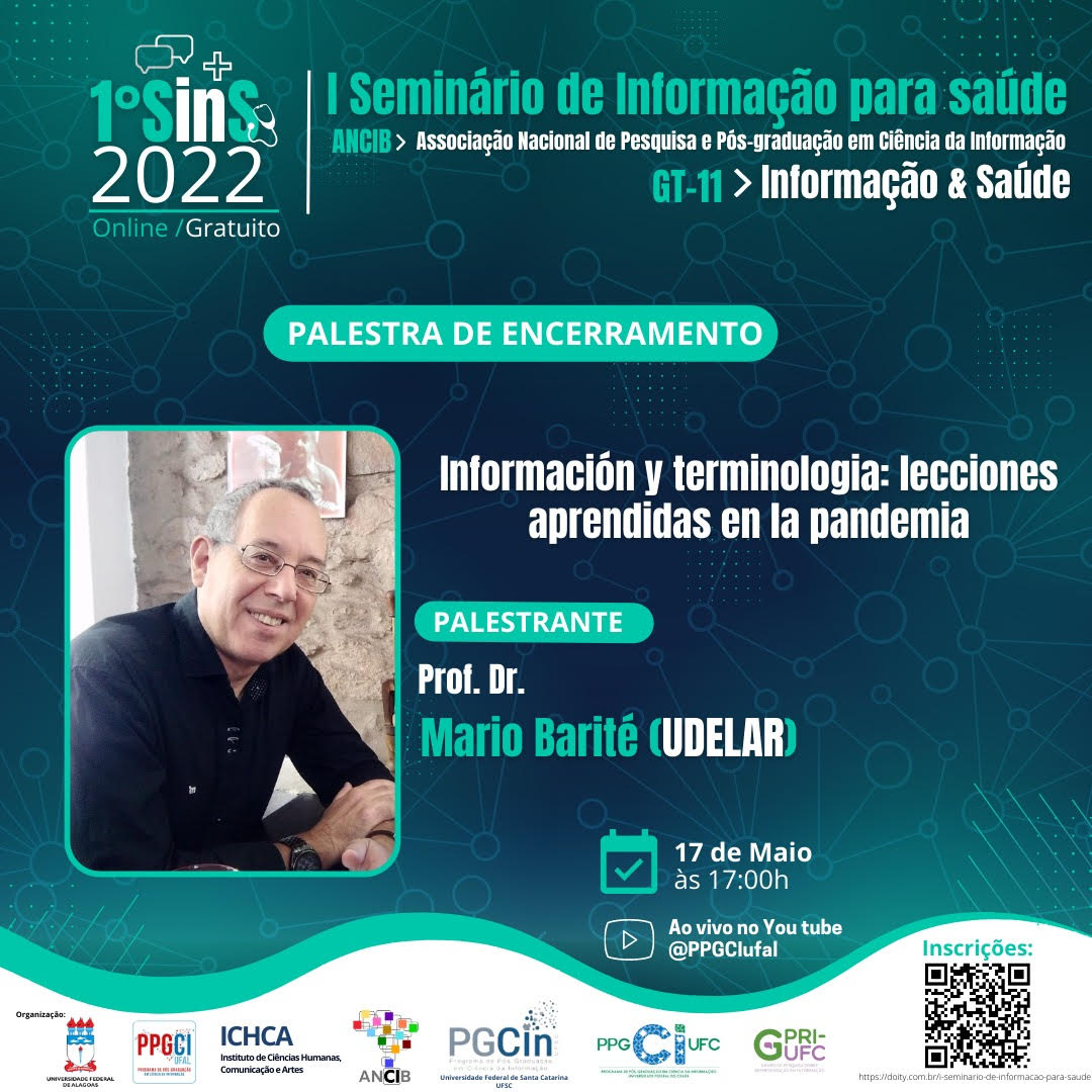 Às 17h, teremos a palestra de encerramento, que será proferida pelo Professor Mário Barité (UDELAR- Uruguay), que trará as questões sobre Información y terminologia: lecciones aprendidas en la pandemia.