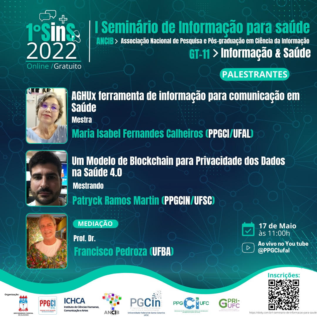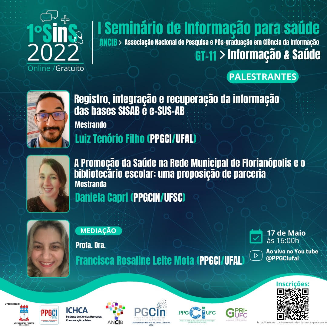 O GT 11 - Informação & Saúde da Associação da Associação de Pesquisa e Pós-graduação em Ciência da Informação (ANCIB) cujas pesquisas contemplam, dentre outras temáticas, estudos das teorias, métodos, estruturas, processos informacionais, em diferentes contextos da saúde e sociedade, estará realizando, no dia 17 de maio do corrente ano, no horário das 8h30min às 17h, o I Seminário de Informação para a saúde (I SINSAUDE).O evento é em formato remoto, gratuito e aberto ao público no canal https://youtub@PPGCIufal.