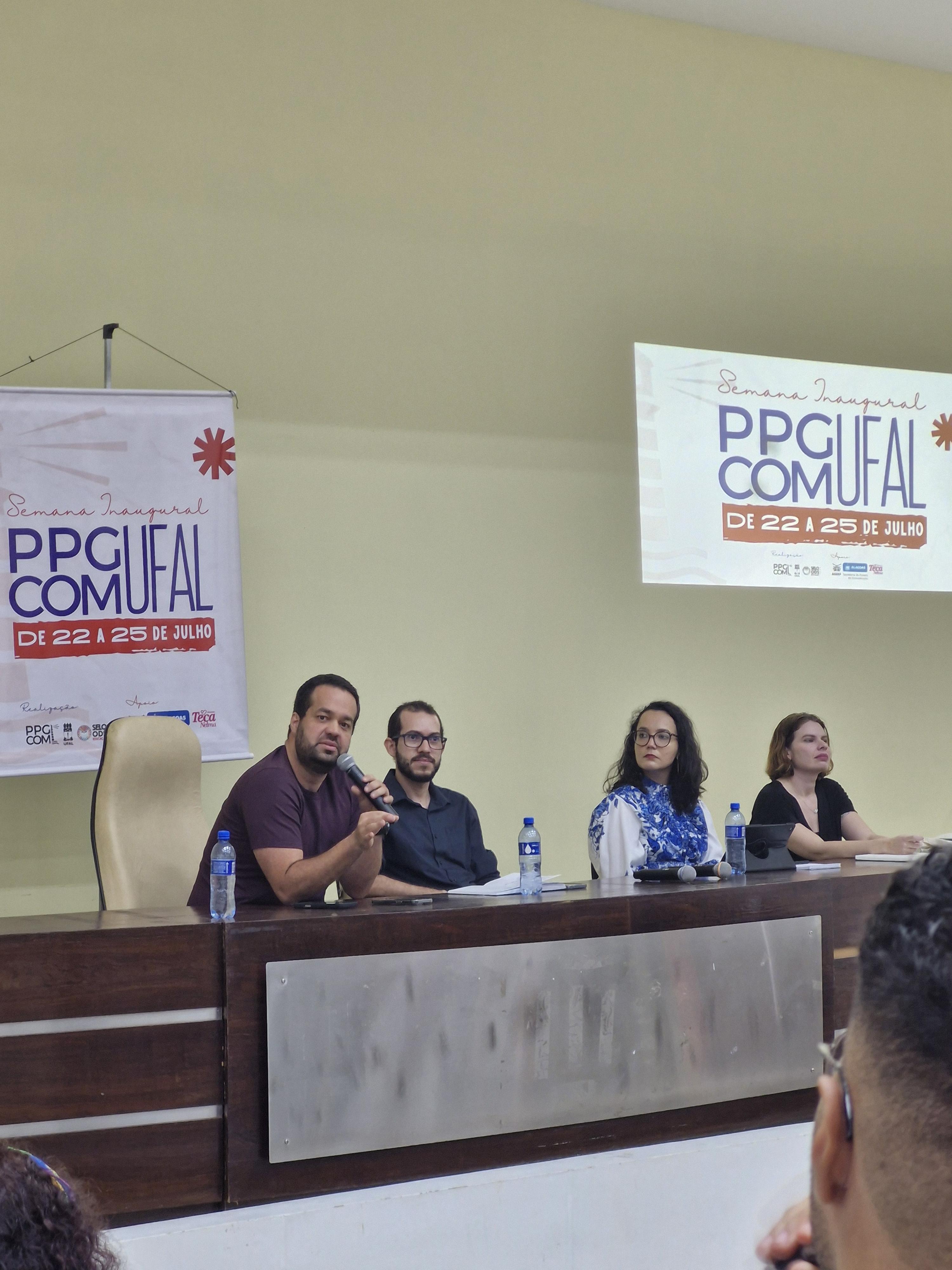 Encerrando as atividades do dia, o debate “Comunicação Pública e Desinformação” reuniu um público atento e participativo. A mesa, mediada pelo professor Anderson Santos, docente do PPGCOM, contou com a presença das professoras Laura Pimenta e Priscila Muniz, também docentes do PPGCOM, e do Secretário de Comunicação do Governo de Alagoas (Secom), Wendell Costa.