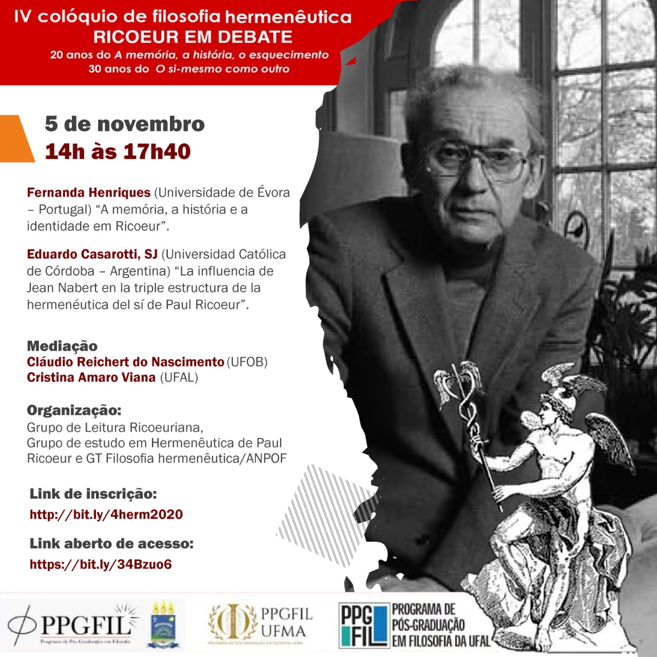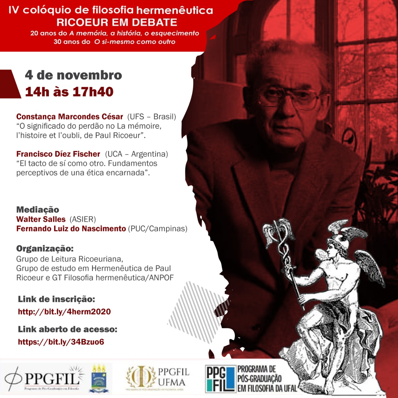Informamos que entre os dias 04 e 06/11/20 ocorrerá o IV Colóquio de Filosofia Hermenêutica, uma iniciativa do PPGFIL da UFPI, com apoio do PPGFIL-UFAL. Mais informações podem ser encontradas nas imagens abaixo.