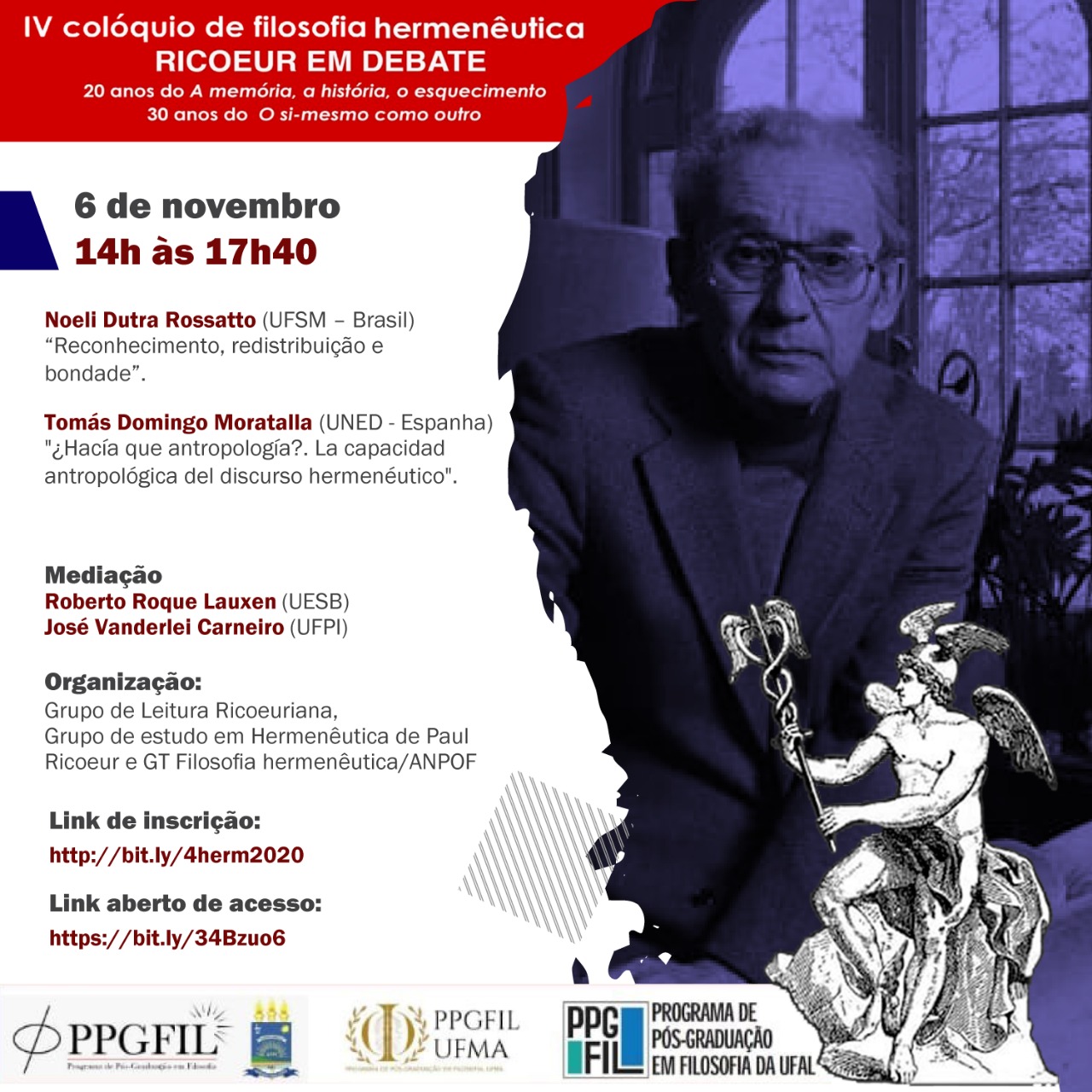 Informamos que entre os dias 04 e 06/11/20 ocorrerá o IV Colóquio de Filosofia Hermenêutica, uma iniciativa do PPGFIL da UFPI, com apoio do PPGFIL-UFAL. Mais informações podem ser encontradas nas imagens abaixo.